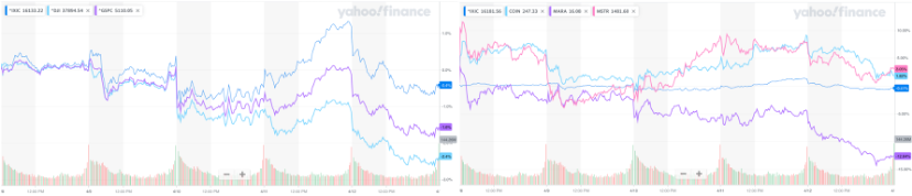 Left: Three Indexes, Right: Nasdaq, COIN & MARA & MSTR (Source: Yahoo Finance)