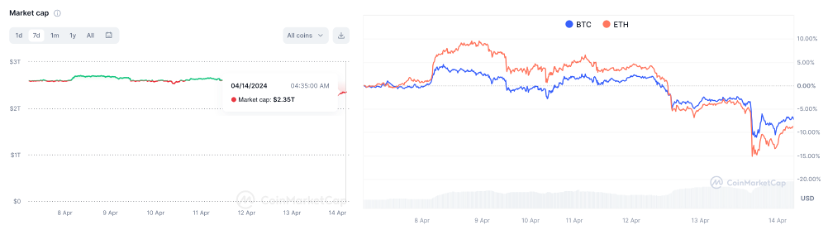 Last week, the cryptocurrency market experienced outflows, with the total market capitalization currently at $2.59 trillion, witnessing a net outflow of approximately $70 billion over the past seven days. Bitcoin and Ethereum underwent a new round of correction from last Monday, approaching lows after the release of unexpectedly strong inflation data on Friday, but then began to rebound over the weekend. As of the early hours of April 7th, the spot price of Bitcoin has risen to $69,360, a decrease of over 2% over the past 7 days. As the second-largest cryptocurrency, Ethereum's current price is $3,337, down over 6% over the past 7 days. Additionally, the market capitalizations of Bitcoin and Ethereum are approximately $1.4 trillion and $408 billion, respectively, accounting for approximately 54% and 16% of the total market capitalization. The gap between Ethereum and Bitcoin continues to widen.
