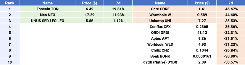 $TON, $NEO, and $LEO emerged as Top 3 gainers, while $CORE, $W, and $UNI were Top 3 losers. Last week, the overall market witnessed a trend of correction, with altcoins generally performing poorly. In the top 100 cryptocurrencies by market capitalization, $TON surged by over 19% weekly, securing the top position. $TON coin is the native cryptocurrency of the Telegram Open Network (TON), used for paying fees to execute smart contracts, use dApps, and participate in governance. The recent surge may be attributed to Telegram's recent incentive program, and $TON's association with Telegram-related products makes it more resilient to market adjustments. In second place, $NEO is the foundational cryptocurrency of the NEO network. The NEO network is a decentralized application development system, which saw a rise of over 11% in the past week. $LEO Token is a utility token created for use on Bitfinex and other trading platforms operated by its parent company, iFinex. As the third top gainer, it remained relatively stable over the past week.