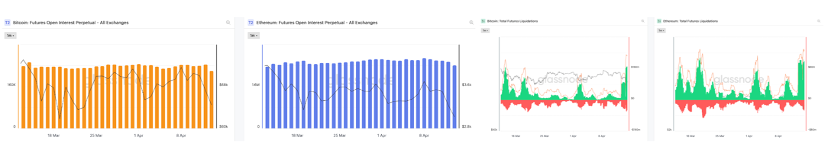 Left: BTC & ETH Open Interest, Right: BTC & ETH Total Futures Liquidations (Data: Glassnode)