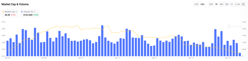 Last week, the market capitalization of Ethereum non-fungible tokens (NFTs) declined by 1% to $8.2 billion. Meanwhile, the total trading volume saw an increase of 4%, reaching $120 million. Among the leading blue-chip NFT collections on Ethereum, CryptoPunks saw a 1% decrease in floor price and a 13% decrease in average price. The second-ranked Bored Ape Yacht Club experienced an 8% decrease in floor price and a 1% decrease in average price. Pudgy Penguins witnessed a 10% decrease in floor prices and a 2% decrease in average prices, currently ranking third. The blue-chip index, measured in cryptocurrency, dropped from 3655 to 3515.