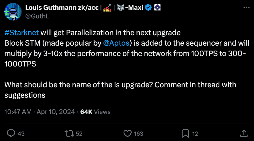 [Layer2] StarkWare's product lead: Starknet plans to introduce parallelism in the next upgrade, with TPS expected to increase 3-10 times. On April 10th, Louis Guthmann, the Product and Market Strategy Lead at StarkWare, announced that Starknet plans to introduce parallelization functionality in the next upgrade. By integrating the Block-STM (a parallel execution engine adopted by Aptos) into the sequencer, network performance is expected to increase from 100 TPS to 300-1000 TPS, indicating a potential 3-10x increase.