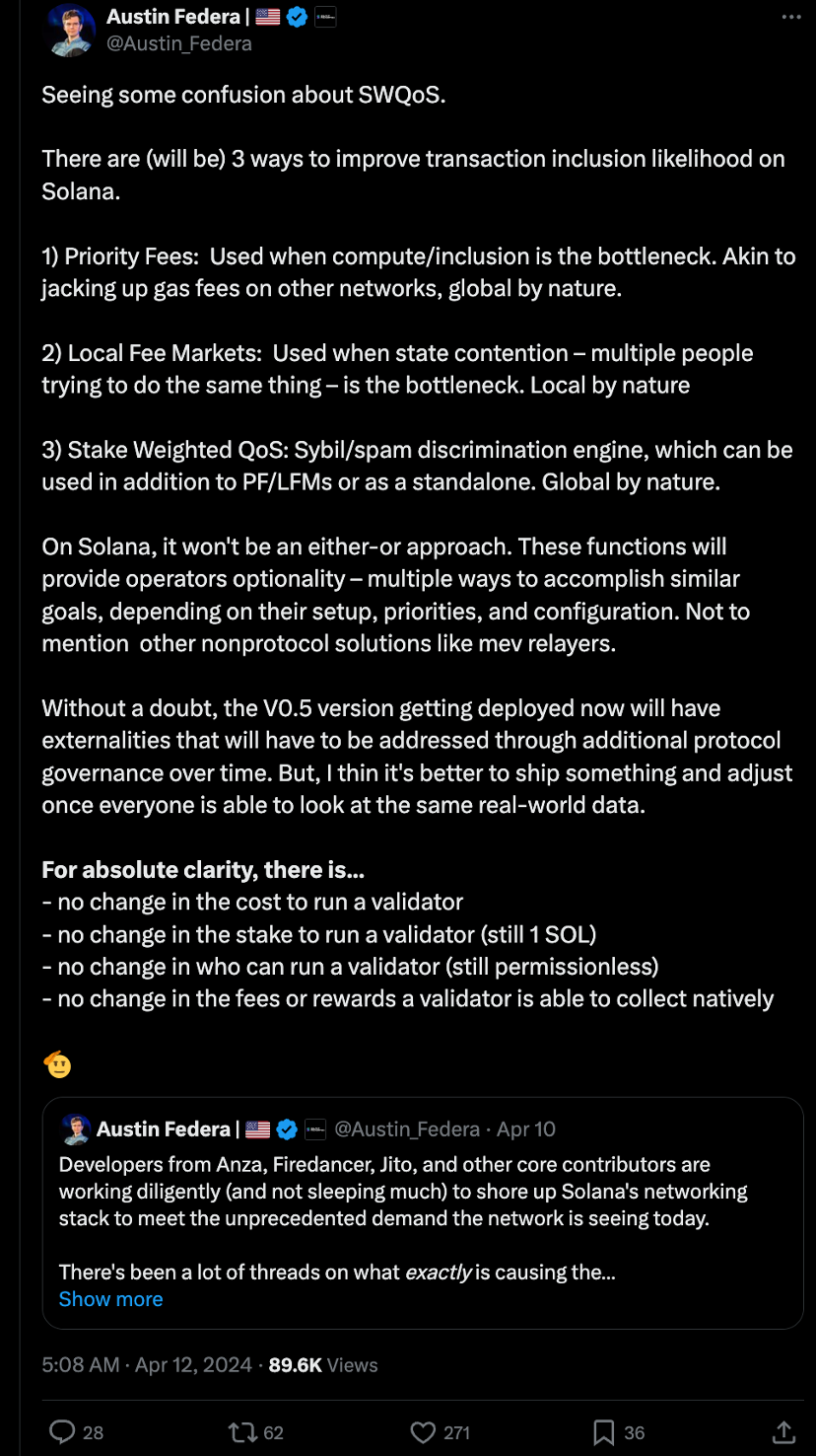 [Solana] Solana is set to introduce three major mechanisms to boost transaction priority and enhance network performance. Solana Foundation's Head of Strategy, Austin Federa, announced that Solana plans to alleviate network congestion by introducing three new mechanisms to prioritize transactions.