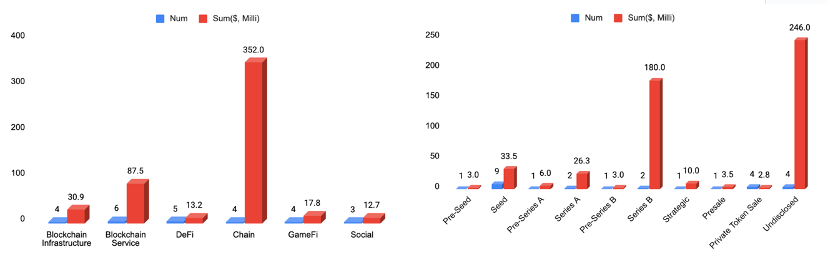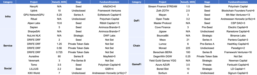 Last week witnessed a total of 34 financing events, raising a substantial amount of over $514 million*. Compared to the previous week, financing activities remained active both in terms of transaction volume and total funding amount. The service sector led with the highest number of financing events, totaling 6. The chain sector recorded the highest total funding amount, raising a total of $352 million, accounting for 68% of the overall financing. The largest financing event was led by Monad, successfully raising $225 million. Monad is a decentralized Layer1 EVM-compatible smart contract platform. More detailed information is provided below.