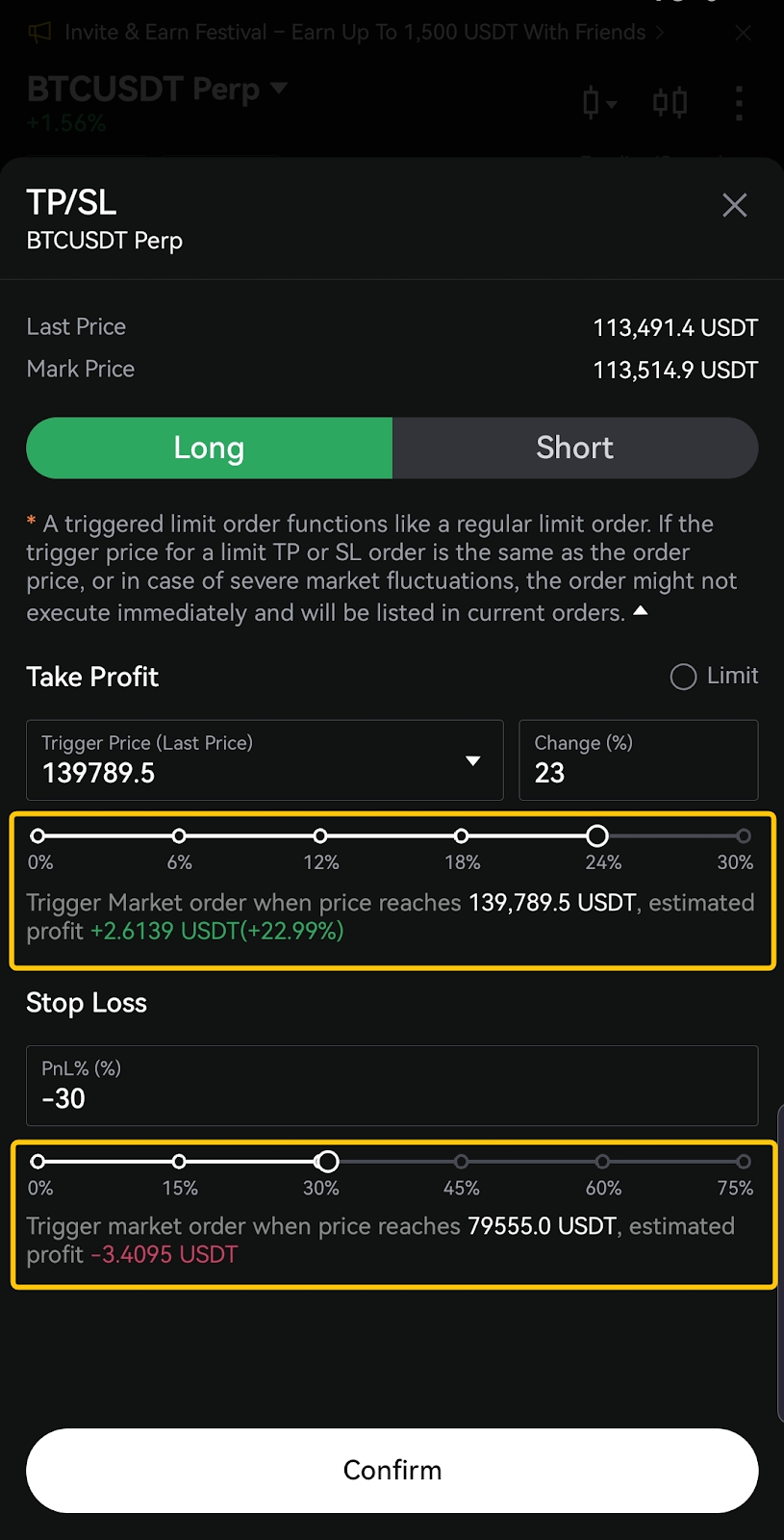 تتميز منطقة إعدادات جني الأرباح وإيقاف الخسائر المتقدمة الآن بشريط تمرير سهل الاستخدام لضبط المعلمات بدقة.