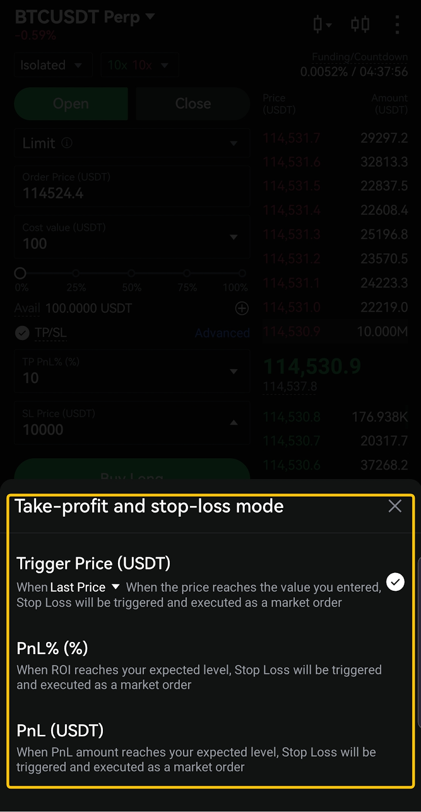 يدعم قسم جني الأرباح وإيقاف الخسائر في لوحة الأوامر الآن أوضاع تنفيذ متعددة؛ حسب سعر التنفيذ، أو نسبة الأرباح والخسائر، أو مبلغ الأرباح والخسائر، ويعرض في آنٍ واحد أسعار التنفيذ والربح المُقدّر.
