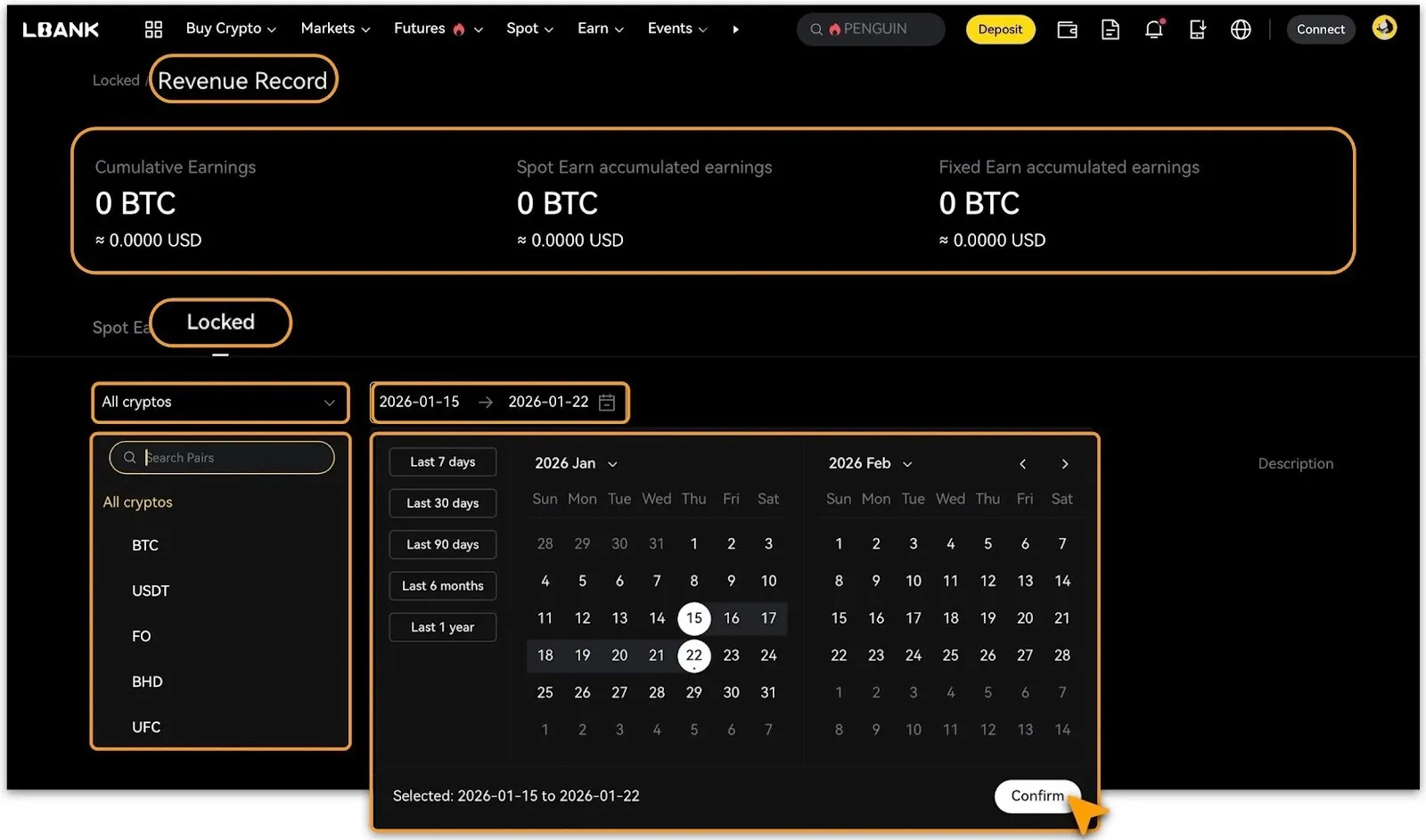 سجّل الدخول إلى الموقع الإلكتروني الرسمي لـ LBank؛ انتقل إلى「Earn > مُقفل」لتصفح المنتجات المتوفرة.
