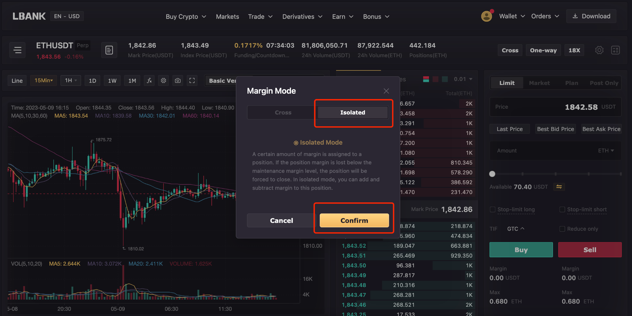 3. لقد قمت الآن بالتحويل بنجاح إلى "الهامش المعزول". استمتع بالتداول! يُرجى التأكد من أنك قمت بتحديد وضع الهامش الذي تختاره قبل فتح أي طلبات أو الدخول في أي مراكز. يمكنك تكرار الخطوات المذكورة أعلاه للتبديل بين وضعي "الهامش المتبادل" و"الهامش المعزول".