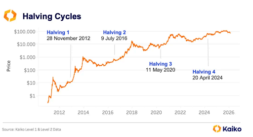 According to research firm Kaiko, this correction fits squarely within Bitcoin's historical 4-year halving cycle. Every previous cycle has produced a 50–80% drawdown after the peak.