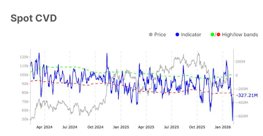 Spot CVD—a measure of buying versus selling pressure—remains negative, meaning sellers are still in control on exchanges.