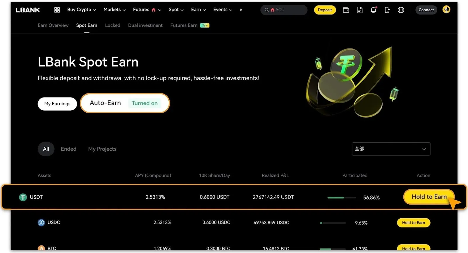 LBank setzt sich dafür ein, die Nutzung der Vermögenswerte seiner Nutzer zu optimieren und führt dafür die Funktion Spot Auto-Earn ein. Dieses leichtgewichtige Ertrags-Tool automatisiert den Prozess und ermöglicht es, ungenutzte Vermögenswerte nahtlos und ohne manuelle Anmeldung in Spot-Earn-Produkte einzubringen.