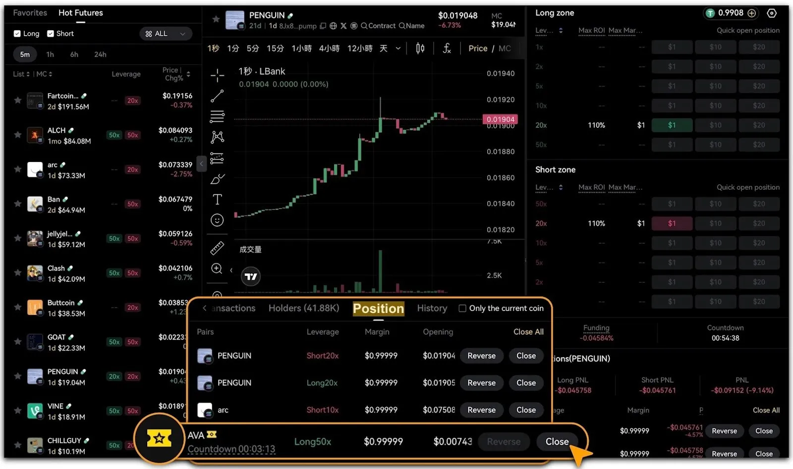 Positionsgültigkeit: Nach der Eröffnung muss die Position innerhalb der festgelegten Dauer geschlossen werden (in der Regel etwa 1 Stunde; siehe Aktionsdetails). Nicht geschlossene Positionen werden nach Ablauf automatisch zum Marktpreis geschlossen. Eine vorzeitige Liquidation kann ebenfalls erfolgen, wenn der Liquidationspreis erreicht wird.