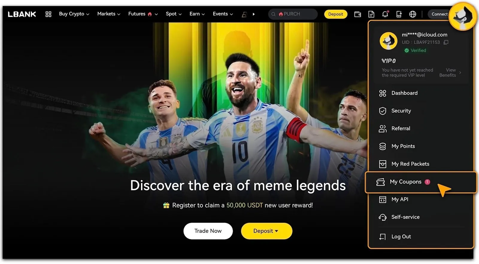 Melden Sie sich bei Ihrem LBank-Konto an und gehen Sie zu „Profil > Meine Gutscheine“..