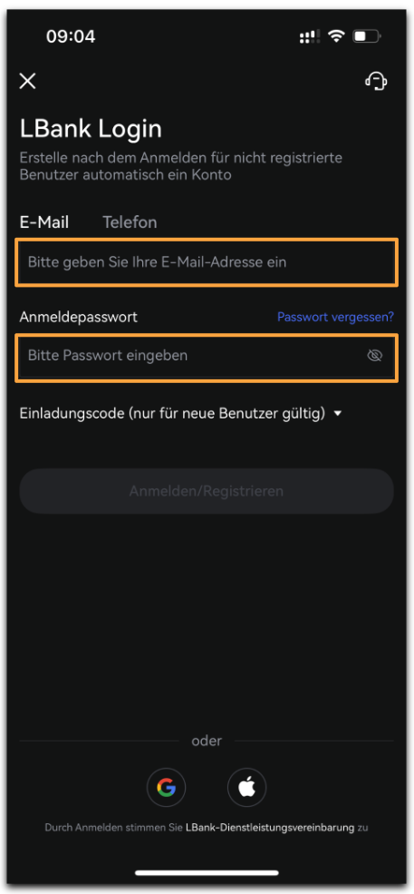 - Geben Sie Ihre E-Mail-Adresse oder Telefonnummer ein (oder melden Sie sich mit einem Drittanbieter-Konto an); legen Sie Ihr Login-Passwort fest und klicken Sie auf [Anmelden / Registrieren].