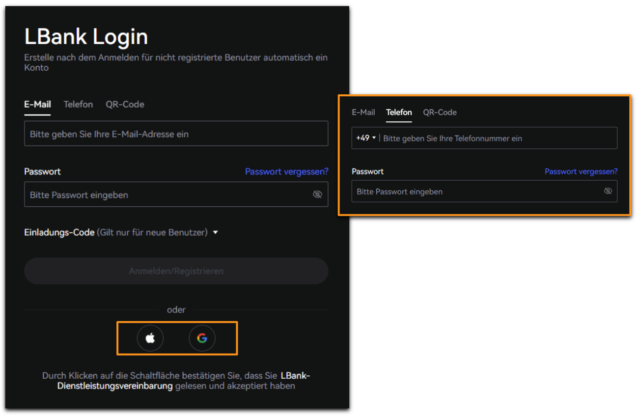- Für eine neue Registrierung können Sie entweder [E-Mail] oder [Telefon] wählen, um die Registrierung abzuschließen.