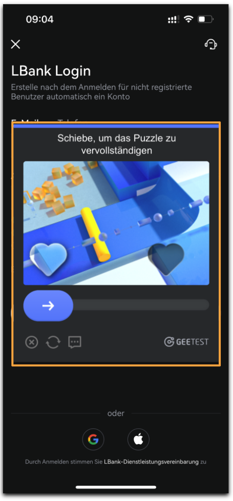 - Alternativ können Sie auch auf [Apple] oder [Google] tippen, um den Registrierungsprozess fortzusetzen.