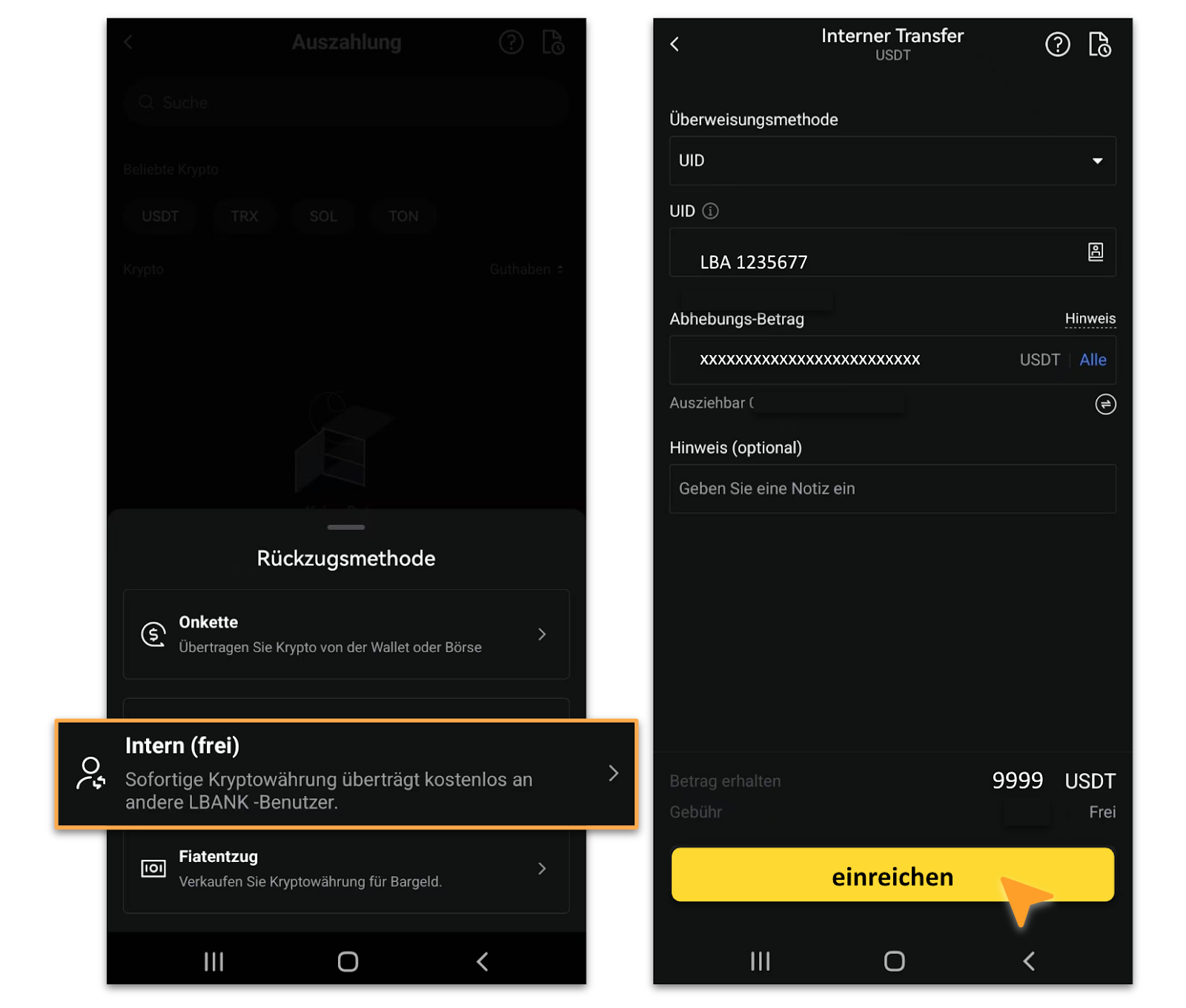 - Geben Sie die [UID] und den Abhebungsbetrag ein.