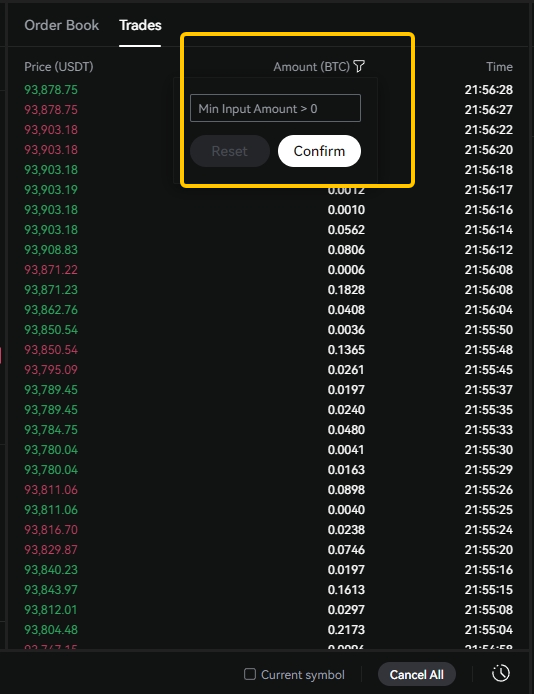 - Das „Trades“-Modul in den Spot- und Futures-Orderbüchern auf Web und H5 wurde um einen Mengenfilter erweitert, der es den Nutzern ermöglicht, die gewünschten Handelsaufzeichnungen schnell zu finden.