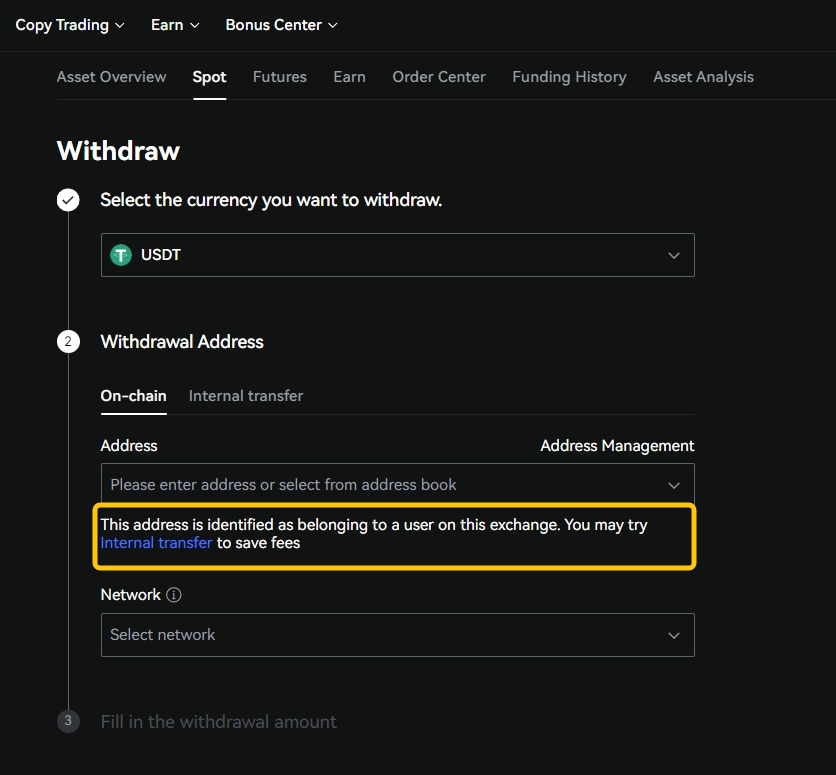- Wenn Nutzer versuchen, an eine interne LBank-Adresse abzuheben, erscheint eine neue Meldung: „Diese Adresse gehört zu einem Nutzer auf dieser Börse. Sie können eine interne Überweisung versuchen, um Gebühren zu sparen.“ So helfen wir Nutzern, Kosten zu reduzieren und sorgen für mehr Sicherheit.