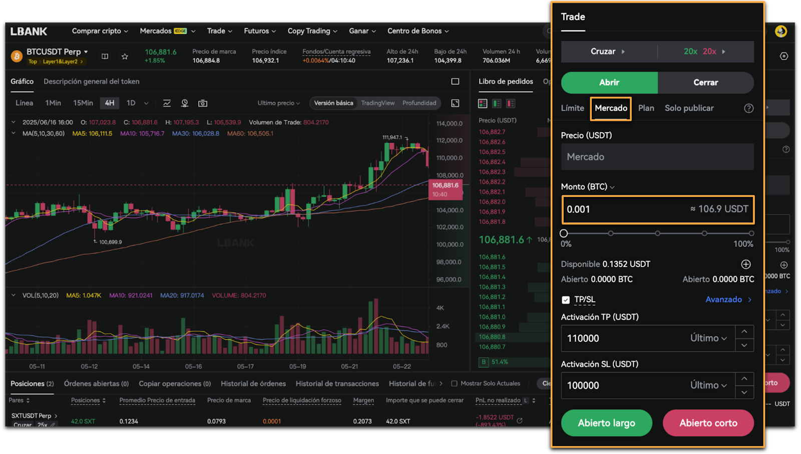 - Selecciona [Mercado], ingresa el [Monto] y toca [Abierto largo] o [Abierto corto].