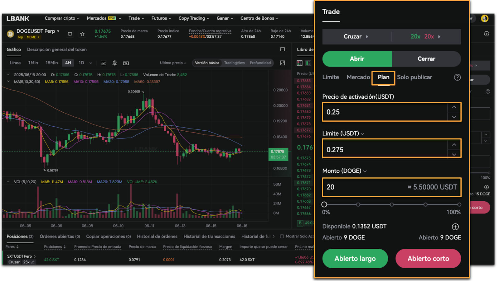 - Selecciona [Plan], ingresa el [Precio de activación], el [Límite] y el [Monto], luego toca [Abierto largo] o [Abierto corto].