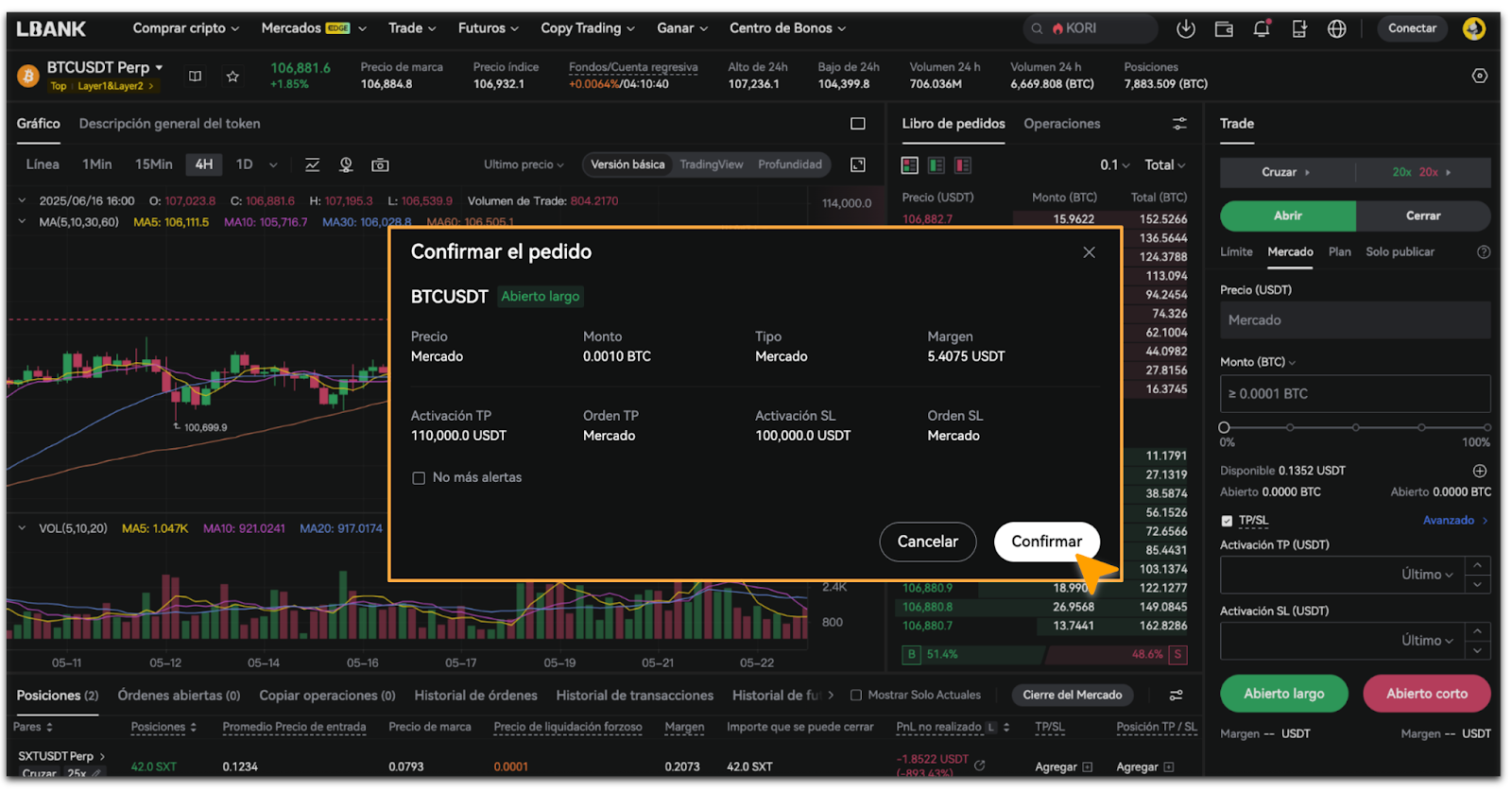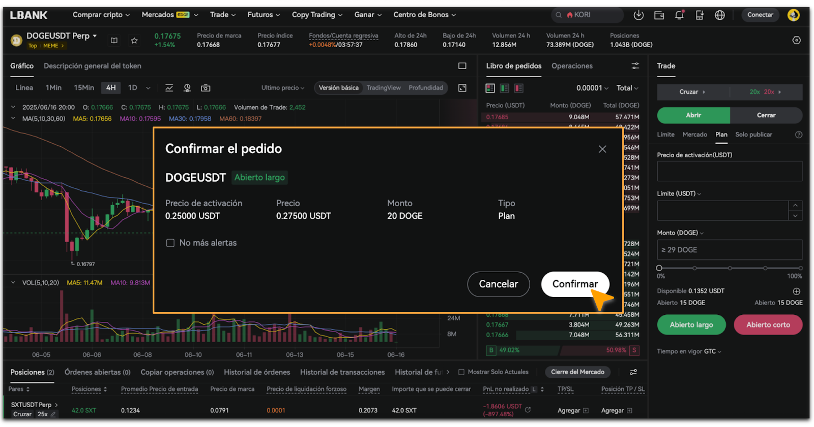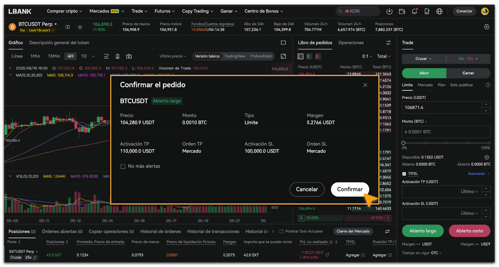 - En la ventana emergente de [Confirmación de Orden], verifica que los datos del precio y del monto sean correctos y toca [Confirmar].