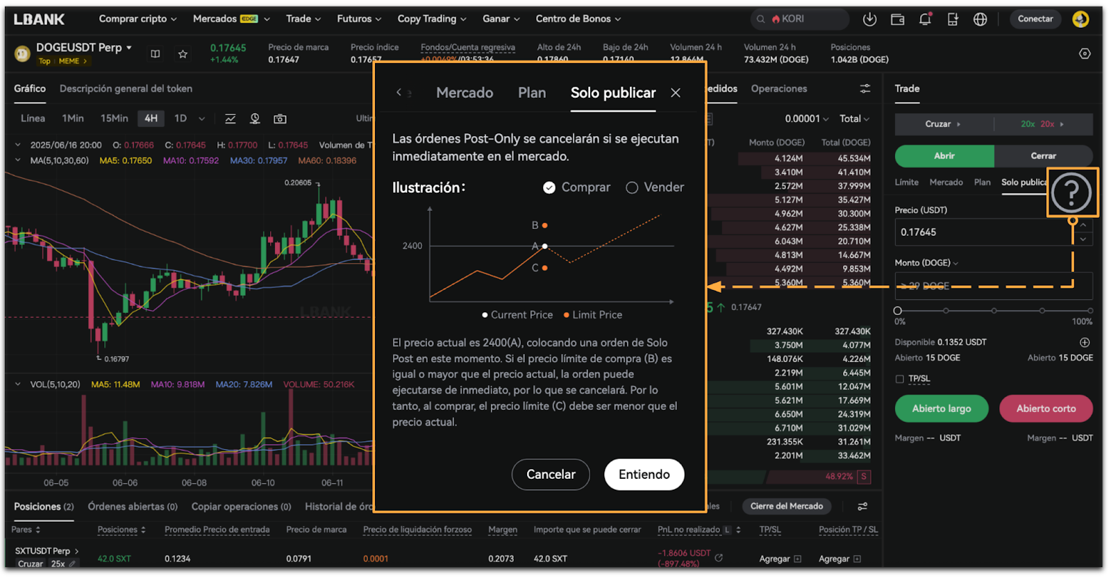 Las órdenes Solo Publicar serán canceladas si se ejecutan inmediatamente en el mercado.