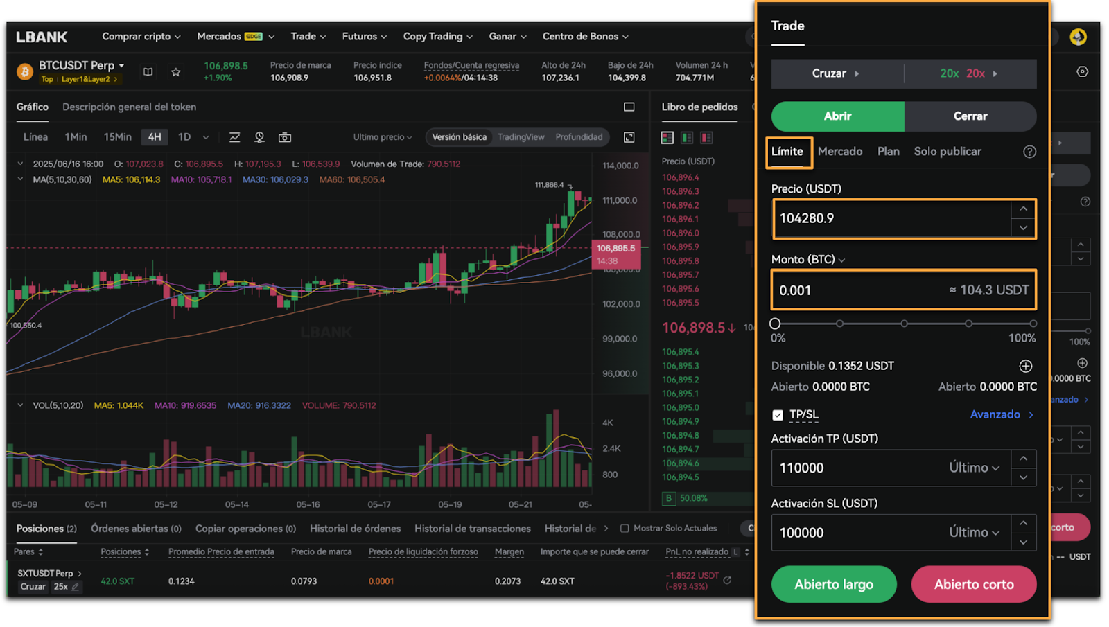 - Selecciona [Límite], ingresa el [Precio] y el [Monto], luego toca [Abierto largo] o [Abierto corto].