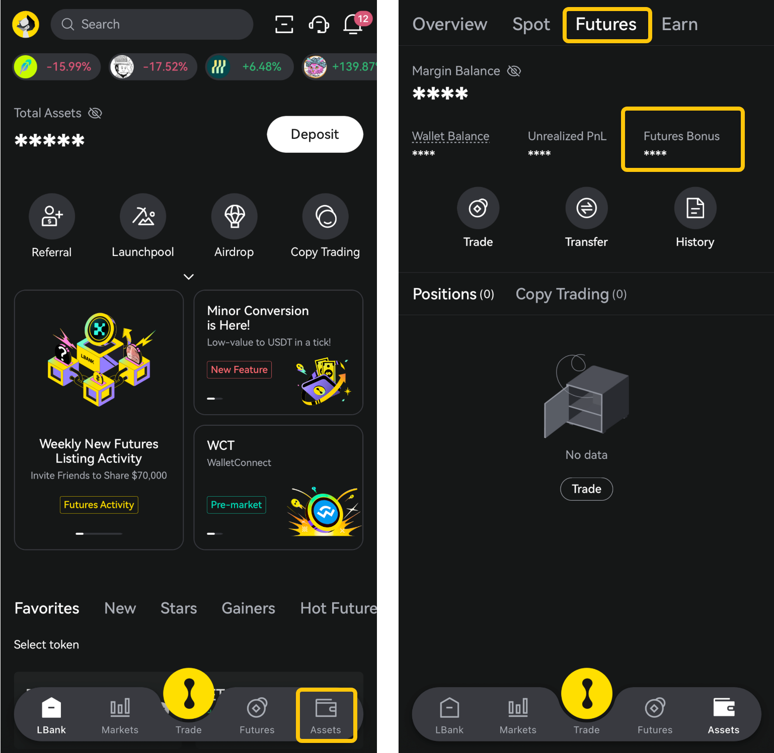Toca [Activos] en la esquina inferior derecha. Navega a [Futuros], luego revisa la sección [Bono de Futuros] para ver el saldo actual de tu bono de futuros.