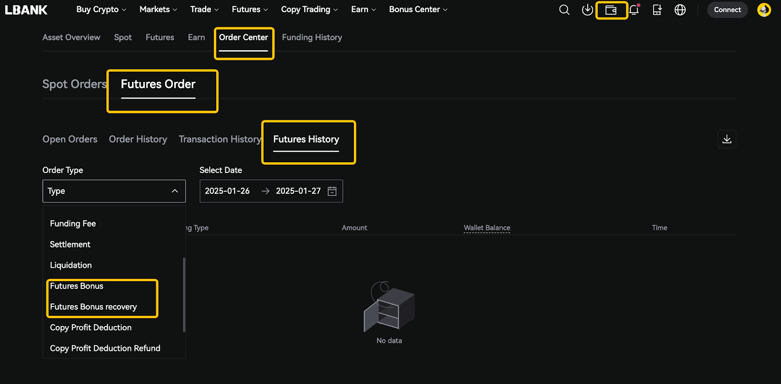Haz clic en el ícono [Resumen de Activos] y ve a [Centro de órdenes]. Navega a [Órdenes de Futuros] - [Historial de Futuros]. En el menú desplegable [Tipo de orden], selecciona [Bono de Futuros] o [Recuperación de Bono de Futuros] para ver los registros correspondientes de crédito y recuperación.