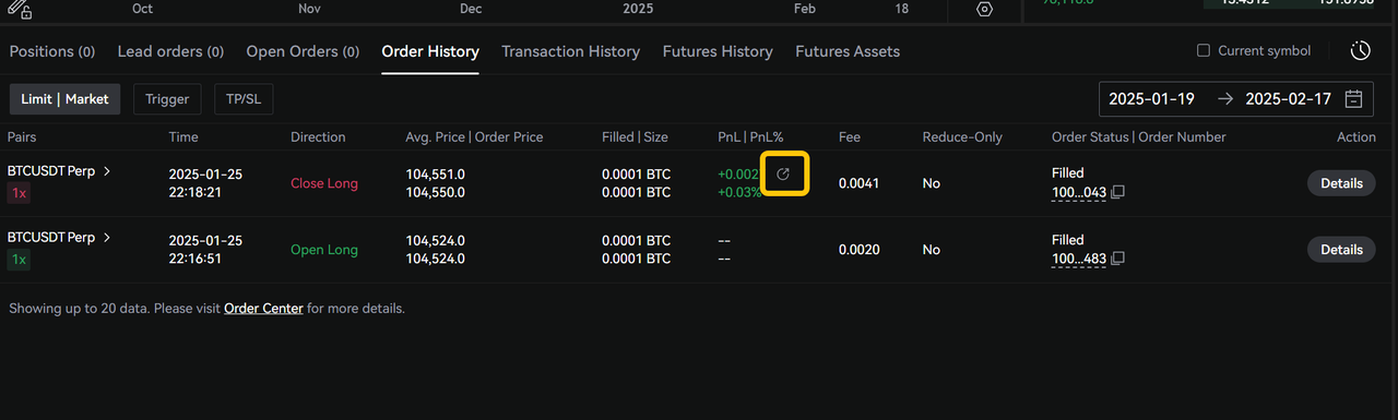 Trading de Futuros - Órdenes Históricas y Compartición de PnL
