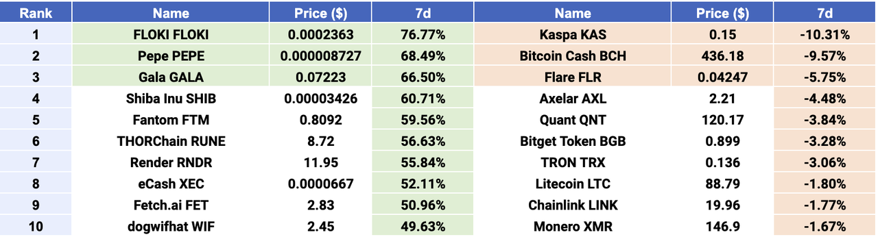 $FLOKI, $PEPE, and $GALA emerged as Top 3 gainers, while $KAS, $BCH, and $FLR were Top 3 losers. In the top 100 cryptocurrencies by market capitalization, MEME coin continued to shine brightly last week, reflecting the bullish sentiment in the cryptocurrency market. $FLOKI emerged as the biggest winner with a surge of over 76%. $FLOKI is a meme cryptocurrency based on the Ethereum blockchain and is a community-driven decentralized finance (DeFi) project. Floki DAO decided to burn over 19 billion tokens, which could be one of the reasons for this astounding surge. The burn occurred on March 9, 2024. Significantly reducing the number of assets in circulation may increase the price of FLOKI as it makes the asset scarcer and more valuable. In the second position, $PEPE is a deflationary meme coin launched on Ethereum, inspired by the iconic Pepe the Frog internet meme. Recent breakthroughs in all-time highs indicate growing market confidence in $PEPE, potentially attracting more investors. Additionally, the overall sentiment in the cryptocurrency market is optimistic, which is favorable for meme coins to rise. In the third position, $GALA is an Ethereum-based token used for value exchange among Gala game players. $GALA can be used for peer-to-peer (C2C) payments, rewarding nodes participating in network operations, and participating in Gala game governance and voting systems. The rise of $GALA indicates increasing investor favoritism towards the gaming sector as the cryptocurrency market heats up.