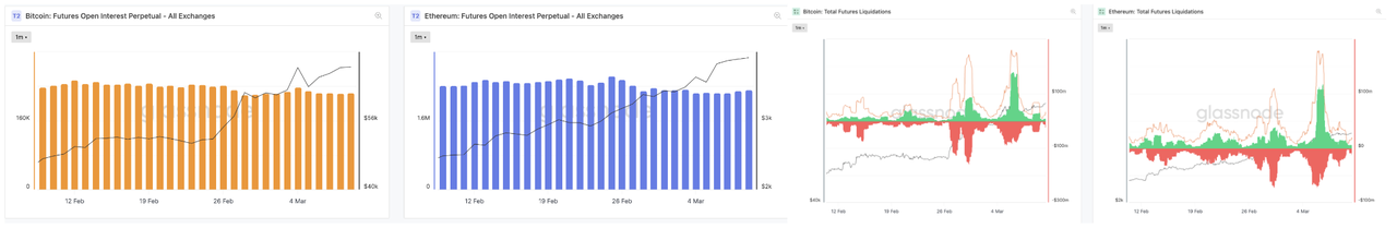 Left: BTC & ETH Open Interest, Right: BTC & ETH Total Futures Liquidations (Data: Glassnode)