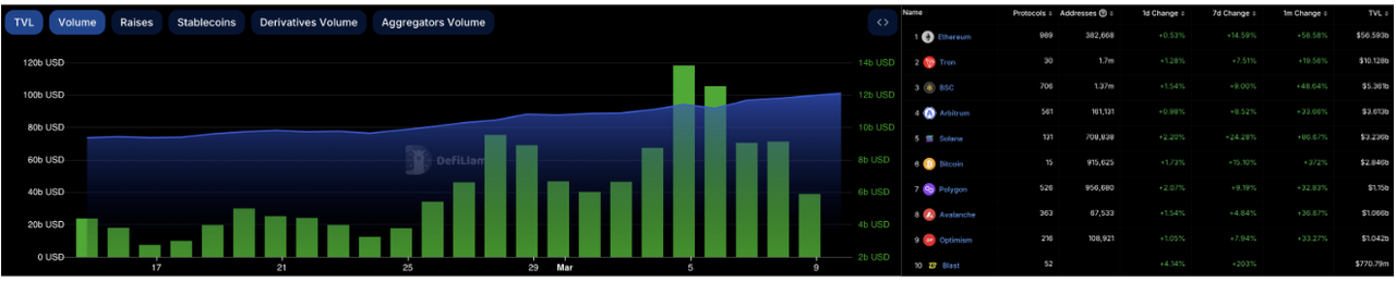 In the decentralized finance (DeFi) market, the total value locked (TVL) continued to increase last week, surpassing $100 billion to reach $101 billion. Over the past seven days, the trading volume on decentralized exchanges (DEXs) rose to $659 billion, marking a 40% increase compared to the previous week. The market share gap between decentralized exchanges (DEXs) and centralized exchanges (CEXs) has relatively narrowed, with DEXs now accounting for 23% of the total CEX trading volume. In the past week, due to the recent bull market in the cryptocurrency market, the TVL of the top ten ranked blockchains has all increased. After the launch of its mainnet, Blast entered the top ten with a seven-day increase of over 200%, while Solana continued to lead as the top gainer with a 24% increase.