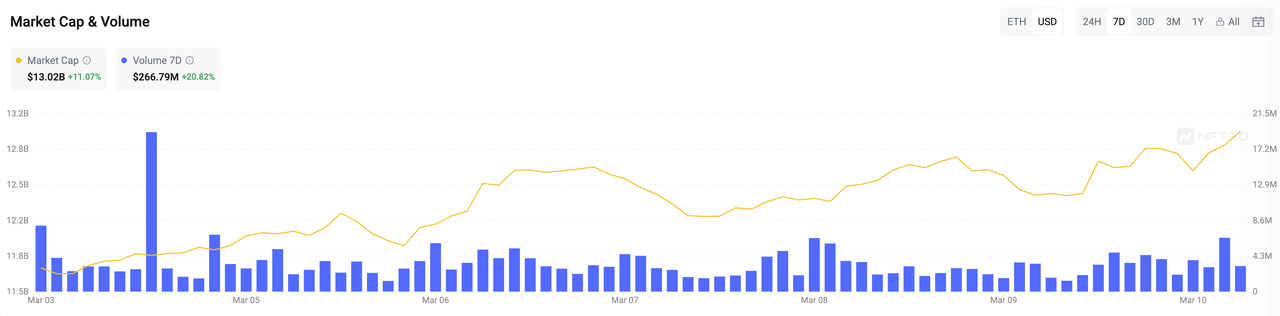 Last week, the total market capitalization of the cryptocurrency market experienced another sustained growth, increasing by nearly $300 billion within a 7-day period to reach the current $2.64 trillion. Bitcoin and Ethereum prices underwent short-term volatility on Monday of last week, with Bitcoin initially dropping after reaching a historical high of $69,000 and briefly falling below the $59,000 mark. However, it quickly recovered and surpassed its previous high. As of the early morning of March 10th, the spot price of Bitcoin reached $69,810, marking a 12% increase over the past 7 days. Ethereum, as the second-largest cryptocurrency, is currently priced at $3,947, with a growth of over 15% in the past 7 days. Additionally, the market capitalizations of Bitcoin and Ethereum are approximately $1.4 trillion and $470 billion, respectively, accounting for approximately 53% and 18% of the total market capitalization.
