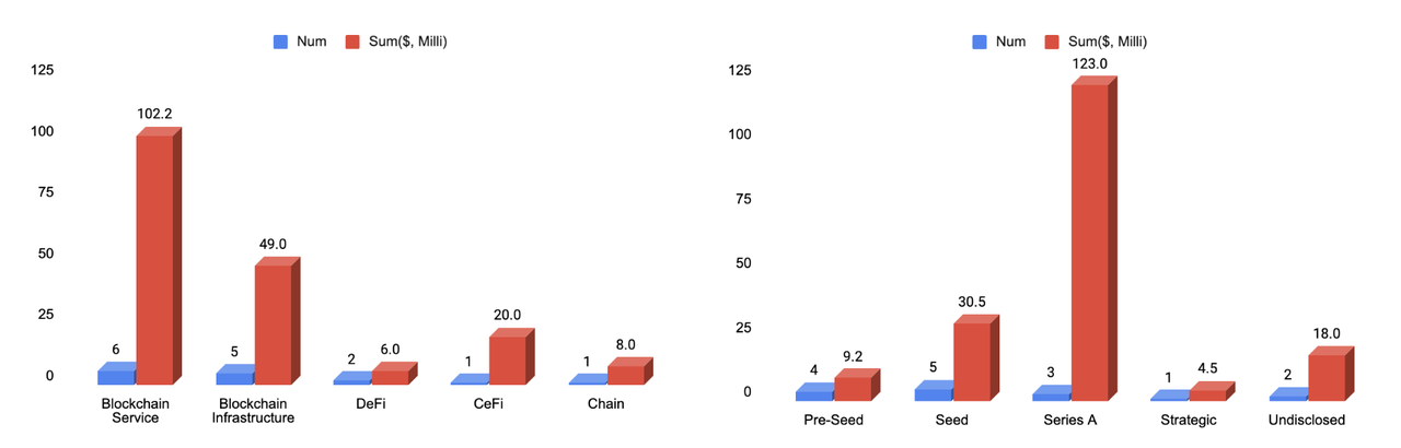 Last week witnessed a total of 32 financing events, raising a substantial amount of over $185.2 million*. Compared to last week, financing activities continue to remain active in terms of both trading volume and total funding. The blockchain service sector leads with the highest number of funding events, totaling up to six. The blockchain service sector also recorded the highest total funding amount, raising a total of 102.2 million dollars, representing 55% of the overall funding. The largest funding event was led by Zama, successfully raising 73 million dollars. Zama is a cryptography company dedicated to developing open-source homomorphic encryption tools for developers. More detailed information is provided below.