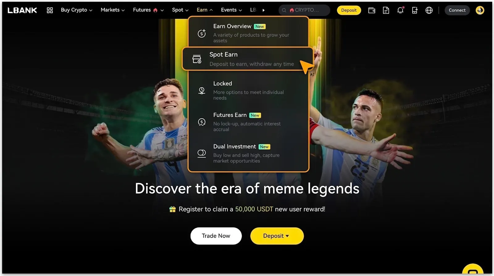 ۱. وارد وبسایت رسمی LBank شوید و سپس در بخش کسب سود وارد قسمت کسب سود اسپات شوید.