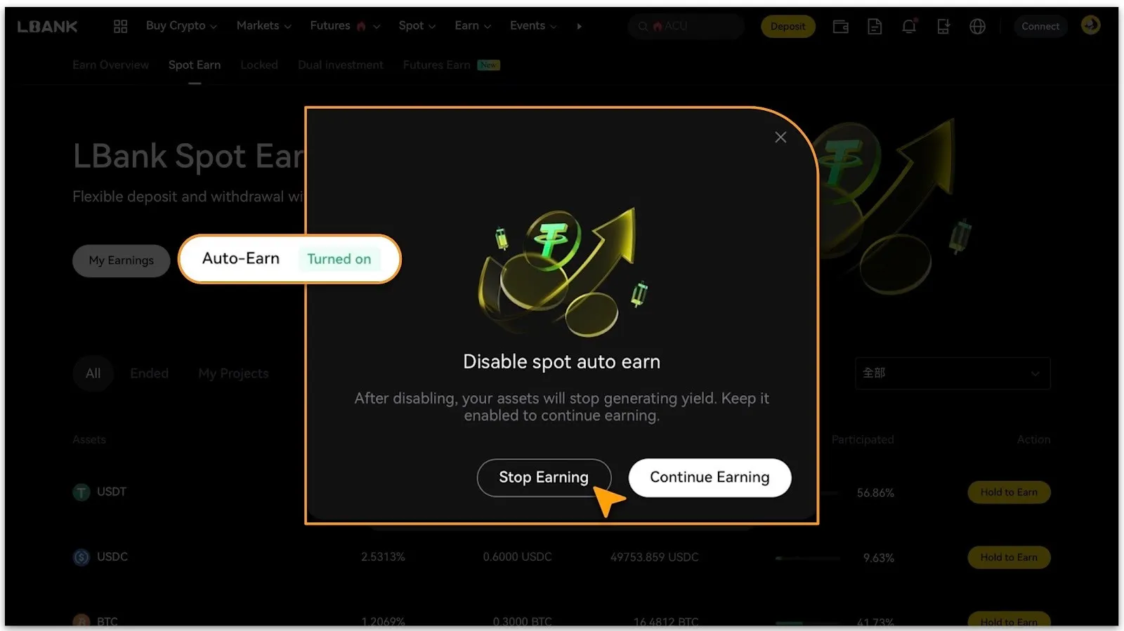 ۱. در صفحه کسب سود اسپات LBank، روی «کسب سود خودکار (فعال)» کلیک کرده و «توقف کسب سود» را انتخاب کنید.