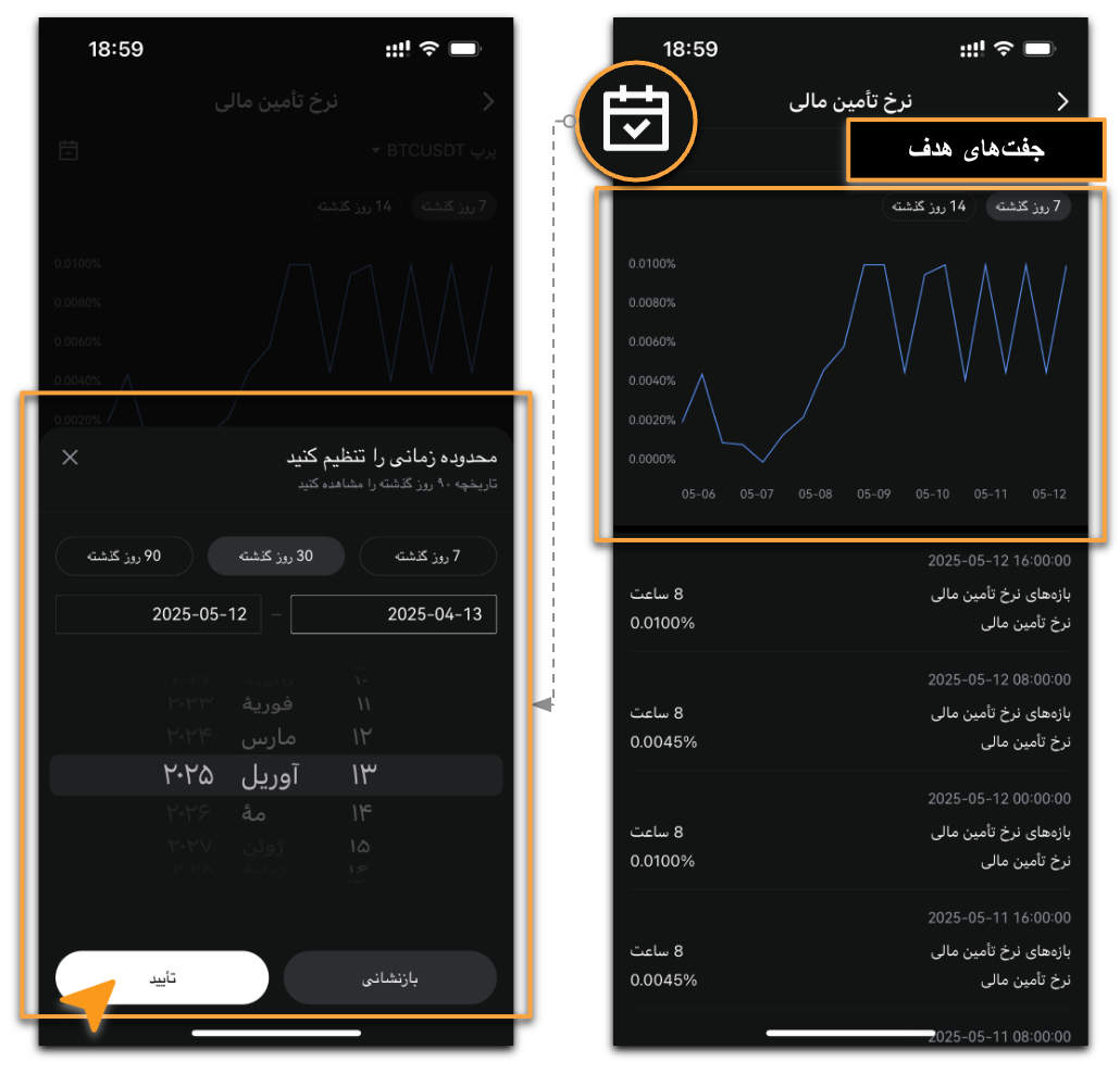 ۷. از آیکون [تقویم] برای تنظیم محدوده تاریخی استفاده کرده و سپس [تایید] کنید.