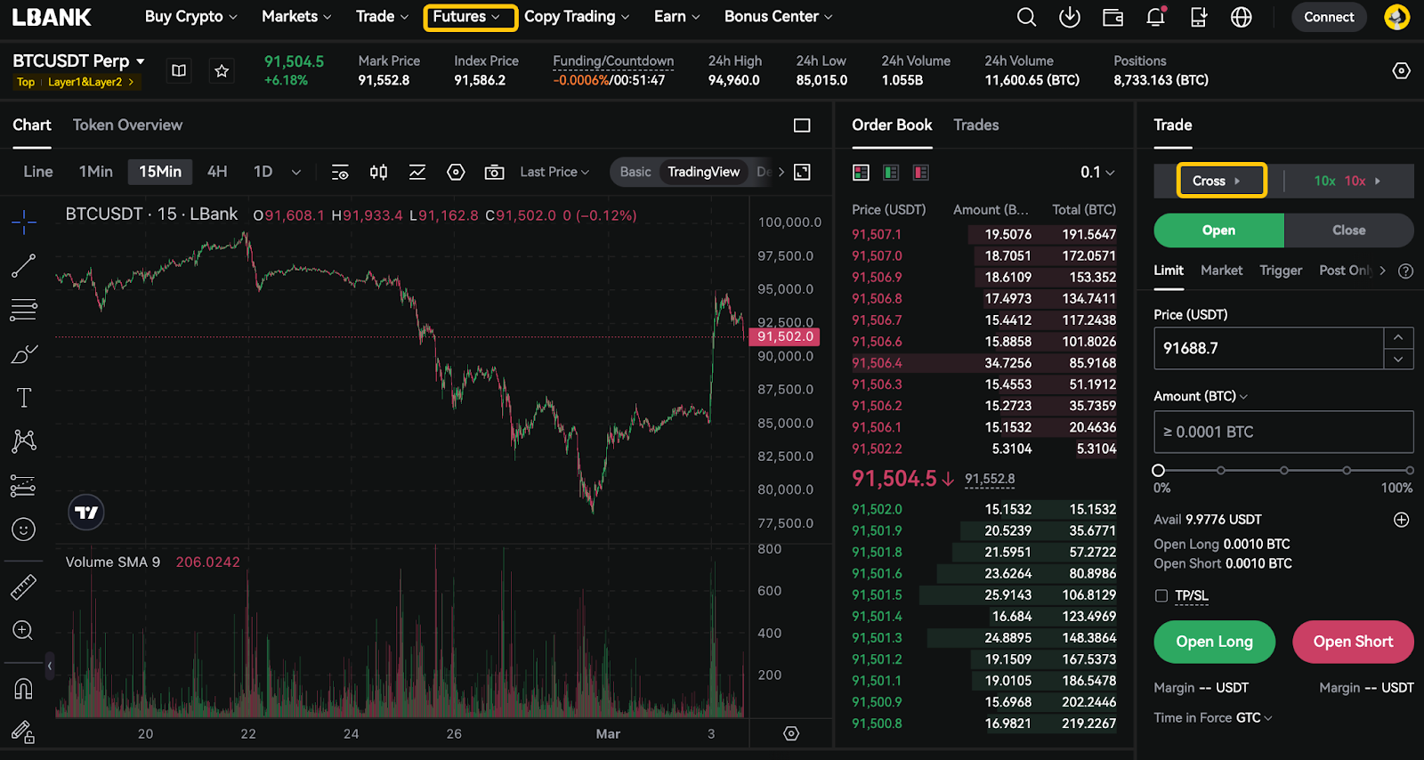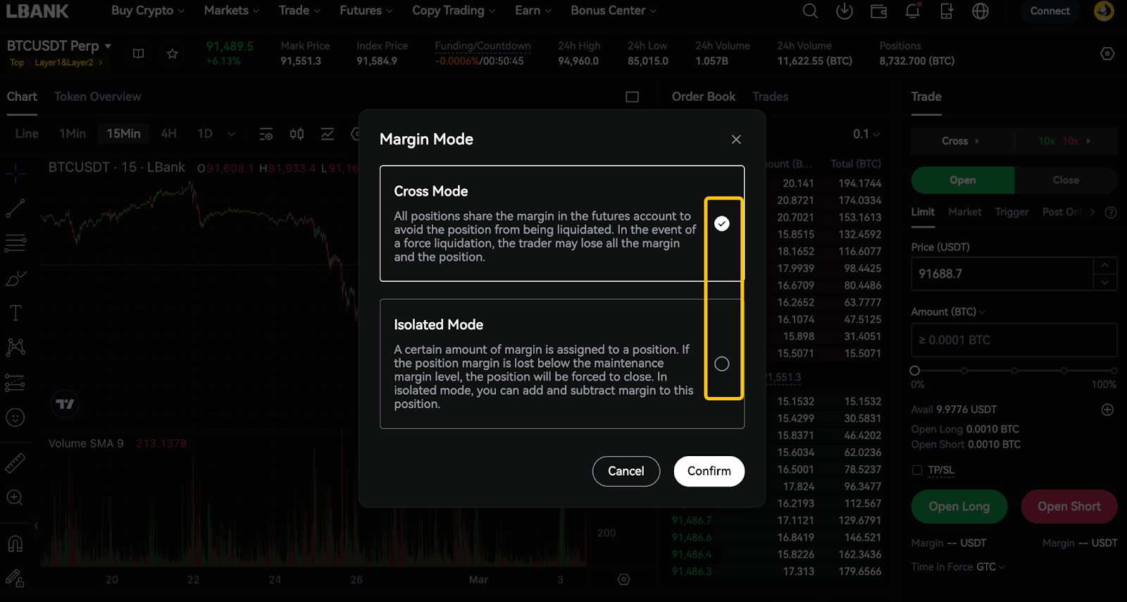 Log in to your LBank account and navigate to the futures trading page. On the page, click the [Cross] button in the top right to switch the position mode.