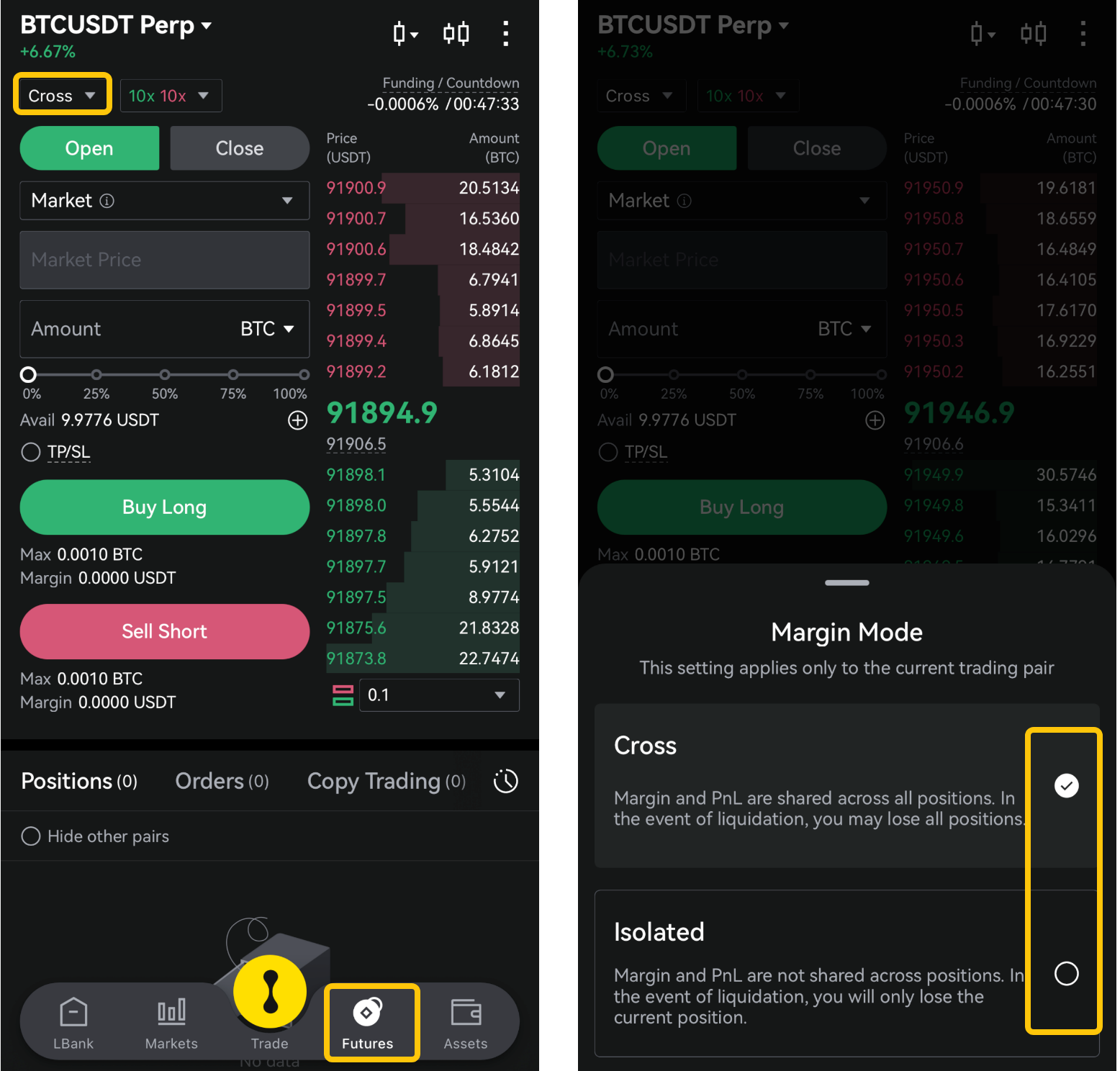 Open the LBank App and select [Futures] from the bottom navigation bar. Tap the default [Cross] button at the top left corner.