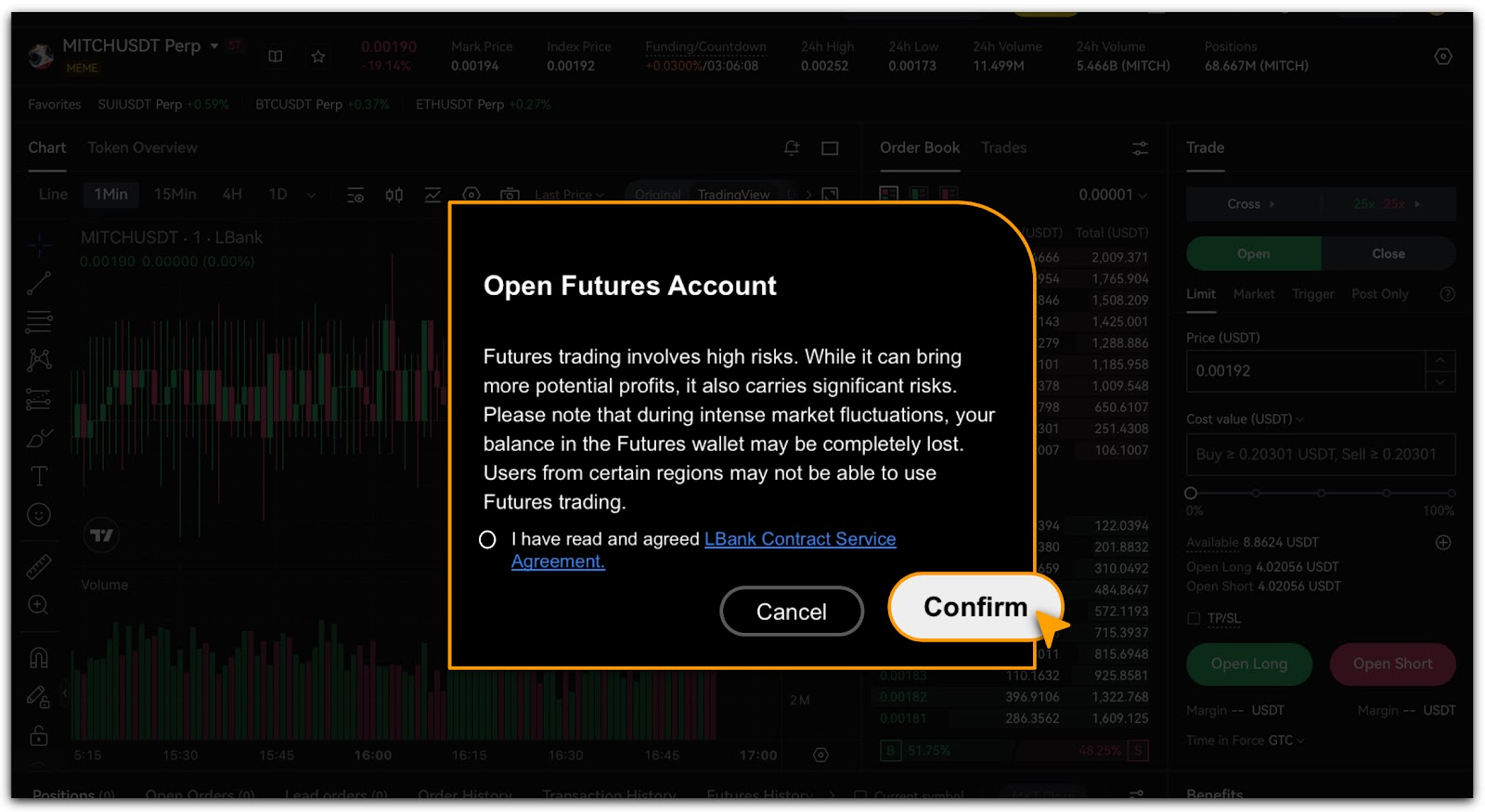 ۱. به وبسایت رسمی LBank بروید، وارد حساب شوید و روی「فیوچرز」در منوی بالا کلیک کنید. سپس روی「تایید」کلیک کنید تا با افتتاح حساب فیوچرز موافقت کرده و مراحل راهاندازی کامل شود.