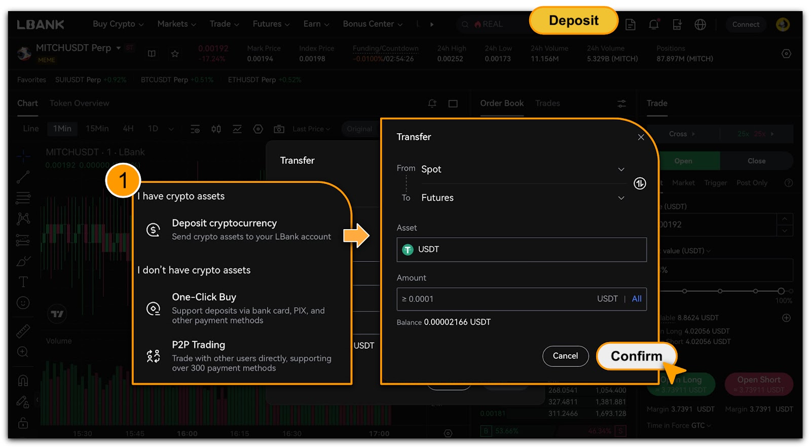 روش ۱: به بخش「واریز」بروید. اگر در حساب اسپات موجودی دارد، روی「واریز کریپتو」کلیک کنید تا وارد「انتقال」شوید. مقدار انتقال را وارد کرده و روی「تایید」کلیک کنید.