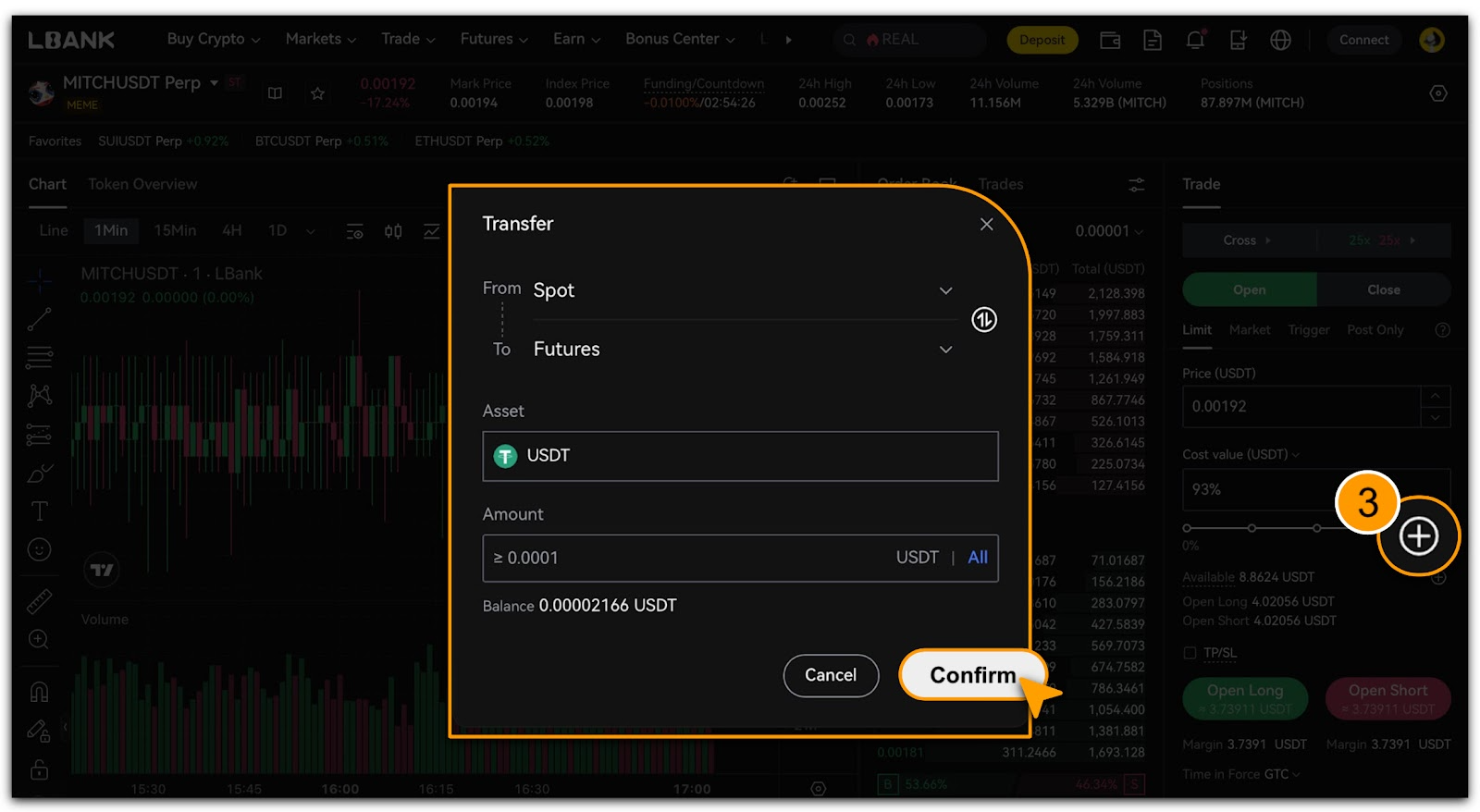 روش ۳: به بخش「معاملات فیوچرز」وارد شوید و روی「+」بزنید. مقدار انتقال را وارد کرده و سپس روی「تایید」کلیک کنید.