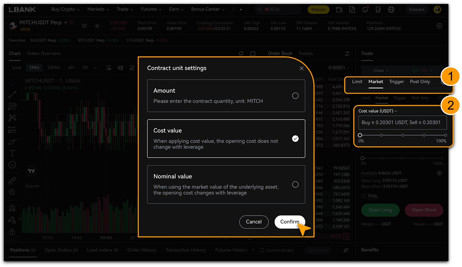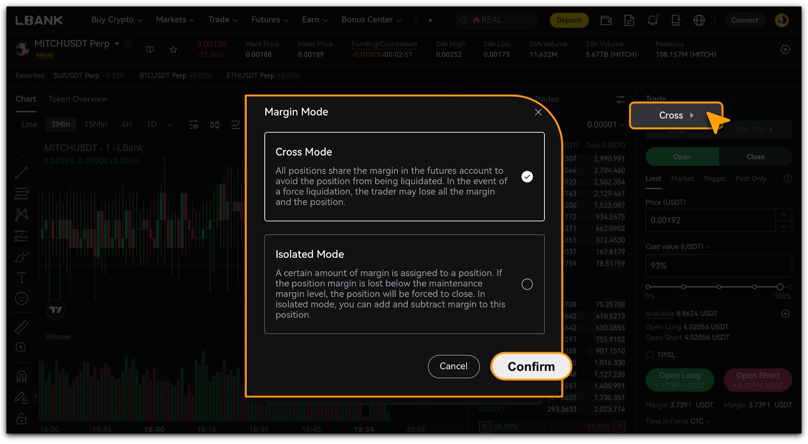 ۲. حالتهای مارجین: از مارجین ایزوله (ریسک ایزوله برای هر پوزیشن) و مارجین کراس (اشتراکی در کل حساب) پشتیبانی میکند. قبل از باز کردن یک پوزیشن در رابط ترید حالتها را تغییر دهید؛ بعد از آن قابل تغییر نیست.