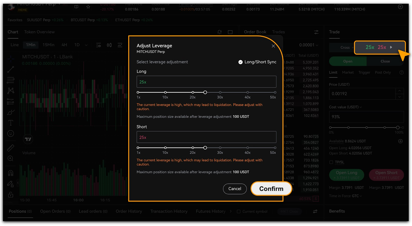۳. تنظیم اهرم (لوریج): قبل از هر معامله فیوچرز، میتوانید با اسلایدر اهرم را (از ۱ تا ۱۲۵ برابر بسته به جفت معاملاتی) تنظیم کنید. لوریج بالا هم سود و هم ریسک را افزایش میدهد؛ مبتدیان باید با اهرم پایین شروع کنند.