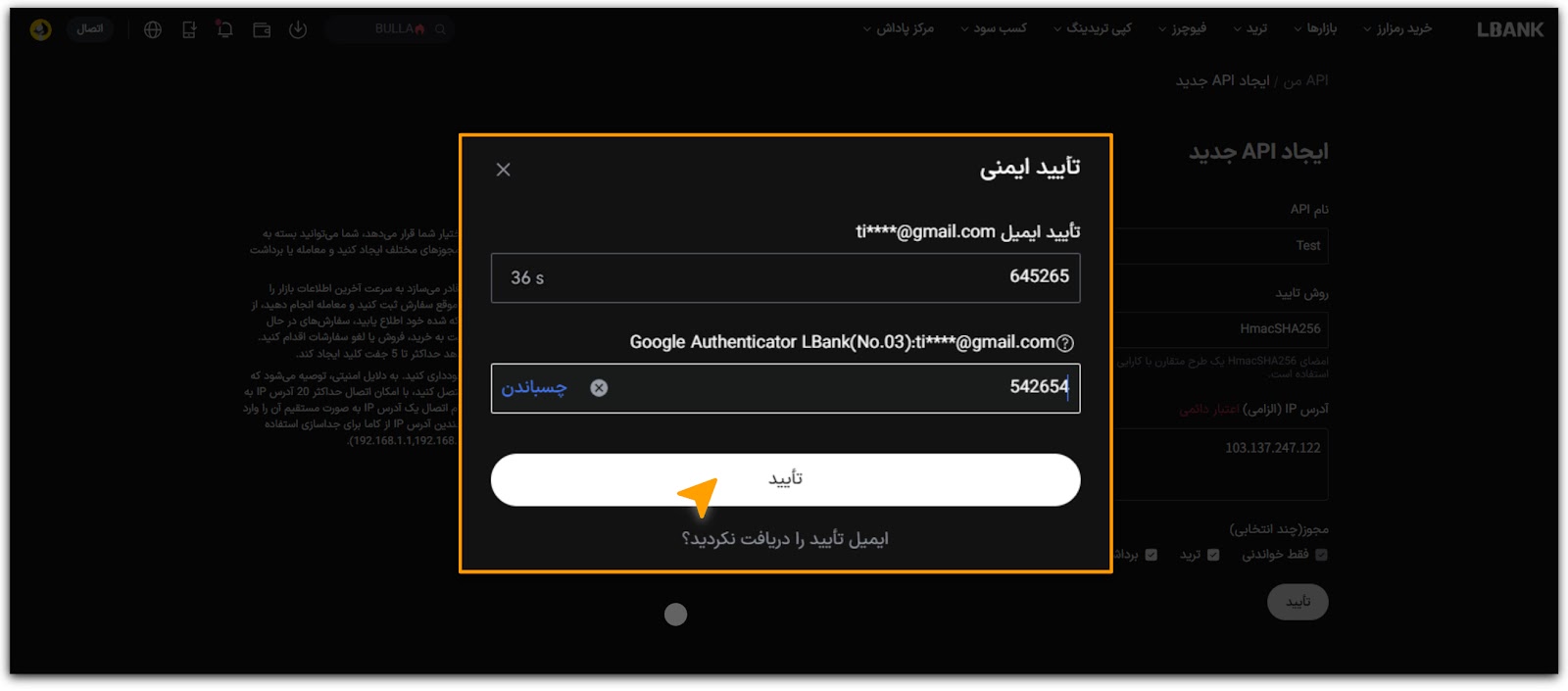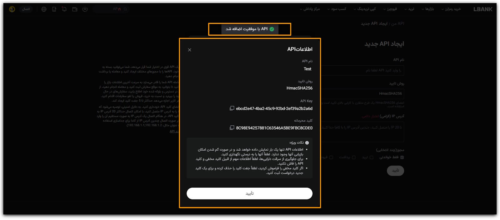 ۹. روی [تأیید] کلیک کرده و API خود را از طریق لیست [API من] مدیریت کنید.