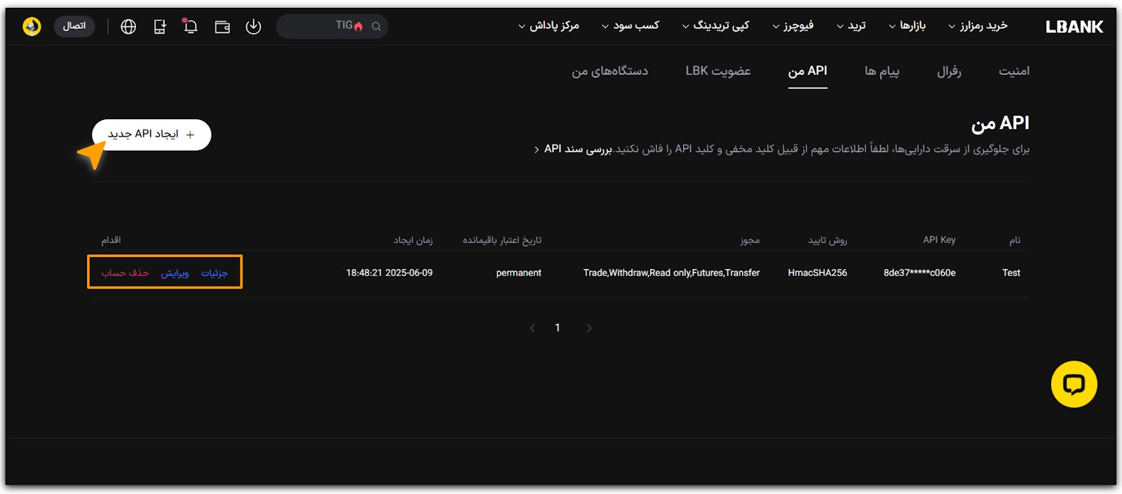 ۳. روی [ایجاد API جدید] کلیک کنید یا از طریق [جزئیات]، [ویرایش] یا [حذف]، APIهای موجود را مدیریت کنید.