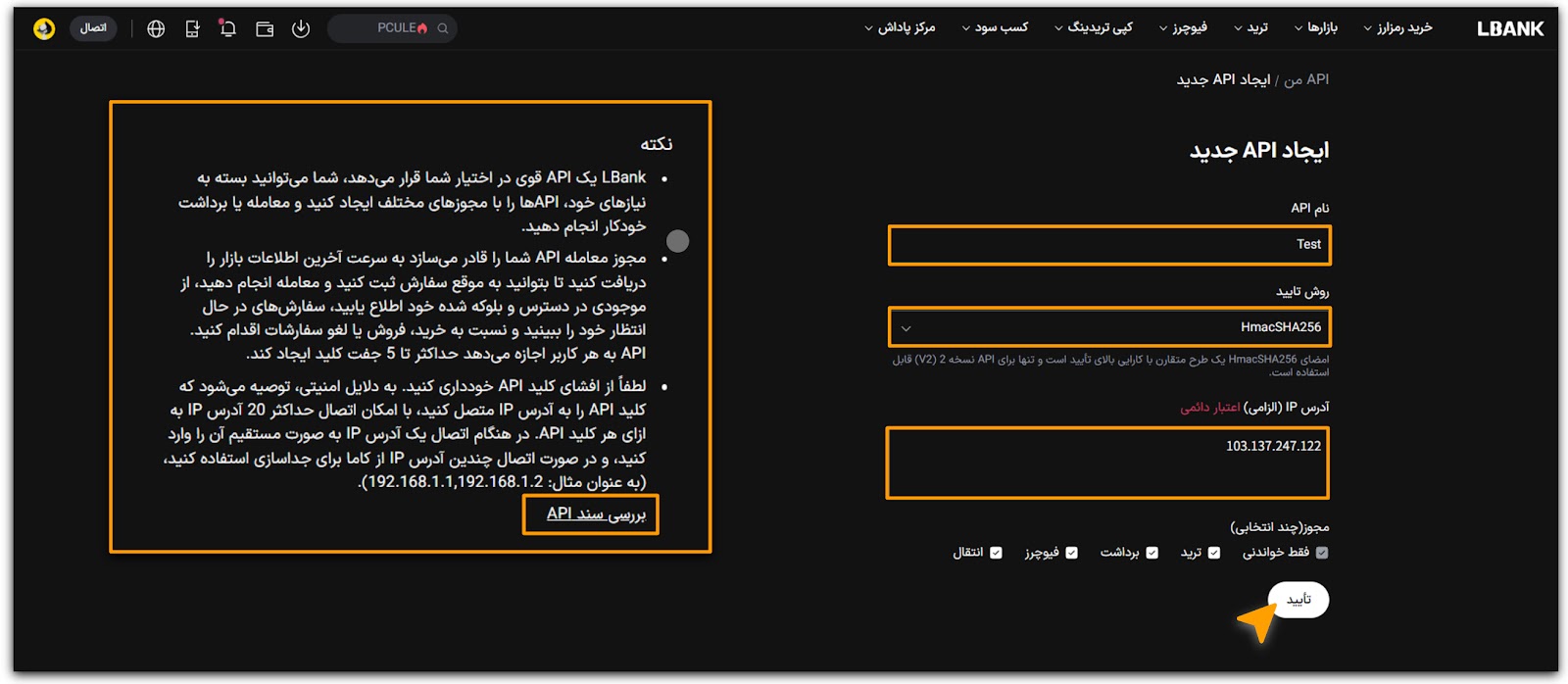 ۵. هدف از API را مشخص کنید (فقط خواندنی، ترید، برداشت، فیوچرز، انتقال؛ امکان انتخاب چند گزینه وجود دارد)؛ سپس روی [تأیید] کلیک کنید.]