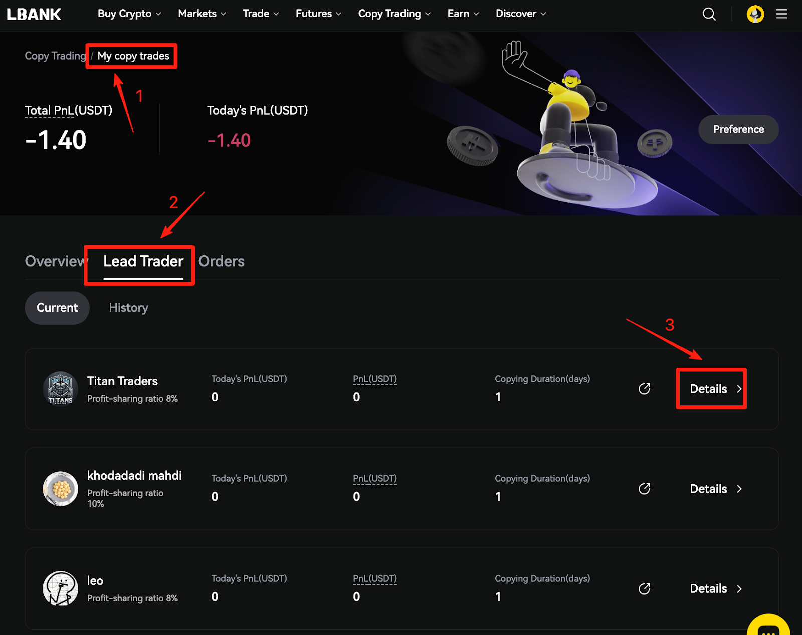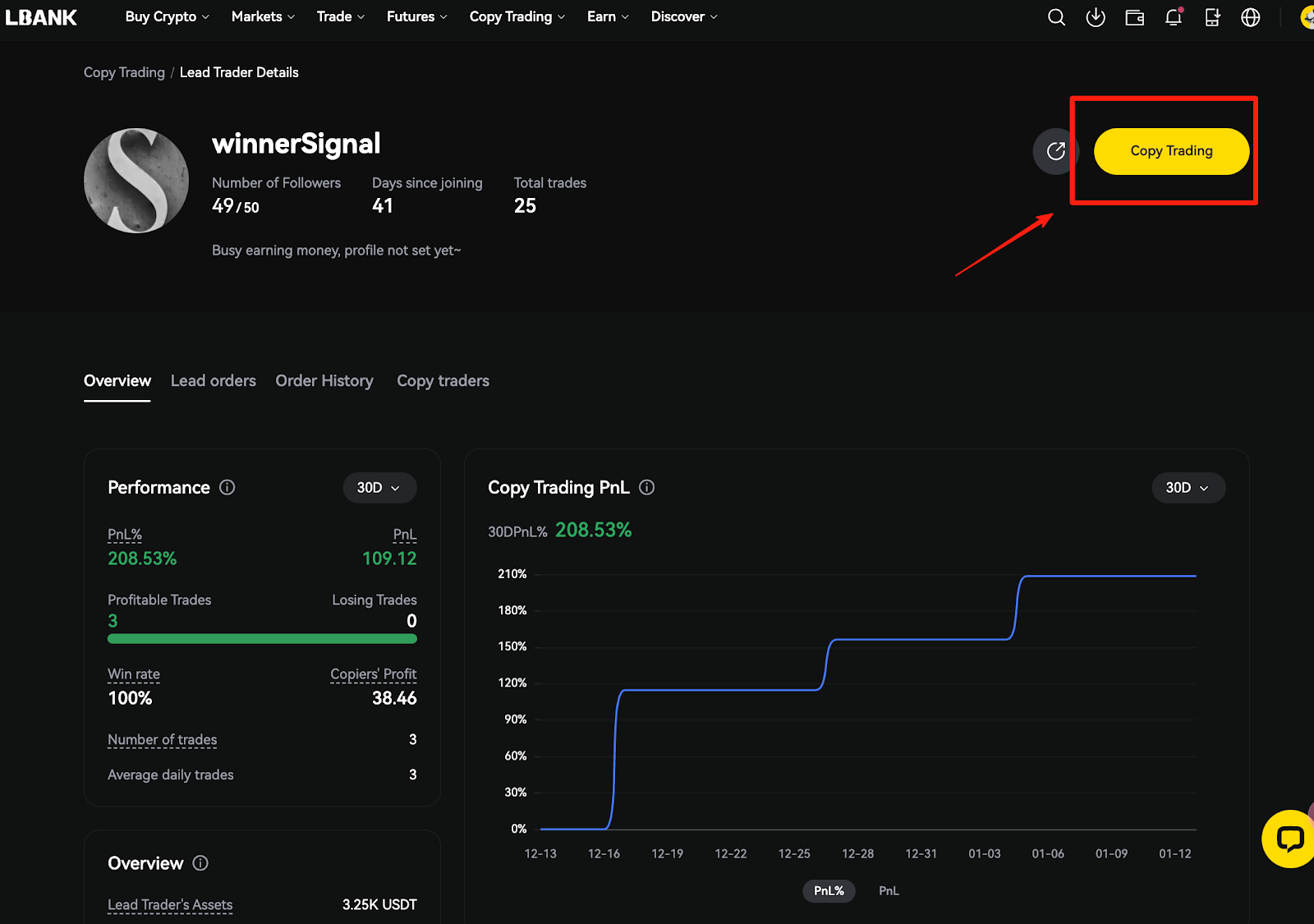 وارد وبسایت رسمی LBank شوید، روی "کپی تریدینگ" کلیک کنید تا به بخش کپی تریدینگ دسترسی پیدا کنید، سپس روی "معاملات کپی من" کلیک کنید تا وارد صفحه مربوطه شوید.